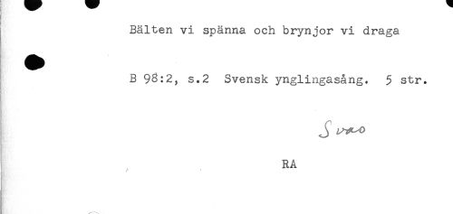 //// T //// Bälten vi spänna och brynjor vi draga //// B 98:2, s.2 Svensk ynglingasång. 5 str. //// i //// RA ////
