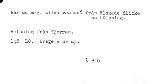 //// Bär du mig, milda vestan? från älskade flicka //// en hälsning. //// Helsning från fjerran. //// LC. Brage 9 nr 45. //// ÅBO ////