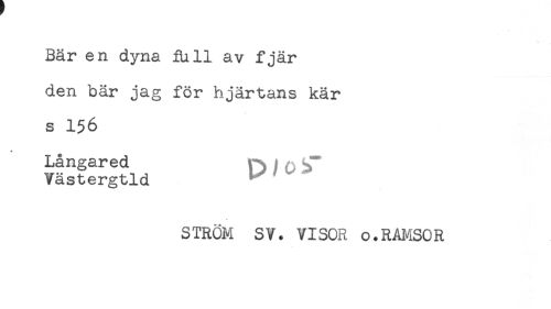//// Bär en dyna Rill av f jär //// den bär jag för hjärtans kär //// s 156 //// + //// Långared fb)O //// Västergtld //// STRÖM SV. VISOR o.RAMSOR ////