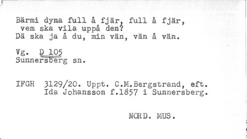 //// Bärmi dyna full å fjär, full å fjär, //// vem ska vila uppå den? //// Dä ska ja å du, min vän., vän å vän. ! //// i //// Vg. D 105 //// Sunnersberg sn. //// ! //// f //// IFGH 3129/20. Uppt. C.M.Bergstrand, eft. //// Ida Johansson f.1857 i Sunnersberg. //// 1 //// i //// i //// 1 //// f= //// < ////