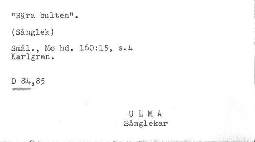 //// "Bära buiten". //// (Sånglek) //// Smål., Mo hd. 160:15, s.4 //// Karlgren. //// D 84,85 //// * //// U L M A //// Sånglekar //// ^ i- . .......J ////