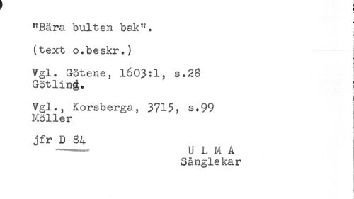 //// "Bära bulten bak". //// : //// L //// (text o.beskr.) //// Vgl. Götene, 1603:1, s.28 //// Götling. //// Vgl., Korsberga, 3715, s.99 //// Möller i ////