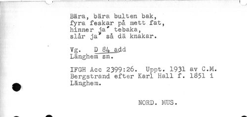 //// Bära, bära buiten bak, //// fyra feskar på mett fat, //// hinner ja* tebaka, //// slår ja så dä knakar. //// Vg. D add //// Länghem sn. //// IFGH Acc 2399:26. Uppt. 1931 av C.M. //// Bergstrand efter Karl Hall f. 1851 i //// Länghem. ////