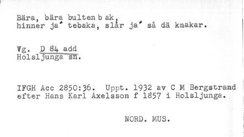 //// Bära, bära bultenb ak, //// hinner ja* tebaka, slår ja* så dä knakar. //// Vg. D 34add //// Holsljunga^sn. i //// IFGH Acc 2350:36. Uppt. 1932 av C M Bergstrand //// efter Hans Karl Axelsson f 1357 i Holsljunga. //// i //// : ////