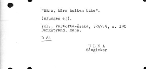 //// "Bära, bära buiten bake". //// (sjunges ej). //// Vgl., Vartofta-Åsaka, 3247:9, s. 190 //// Bergstrand, Maja. //// D 34 //// U L H A //// Sånglekar //// //// /