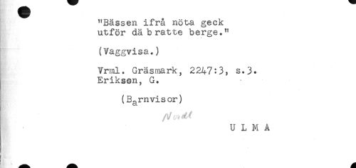 //// "Bässen ifrå nöta geck //// utför dä b ratte berge." //// (Vaggvisa.) //// Vrml. Gräsmark, 2247:3, s.3. //// Eriksen, G. //// (Barnvisor) //// - //// U L M A //// r. ////