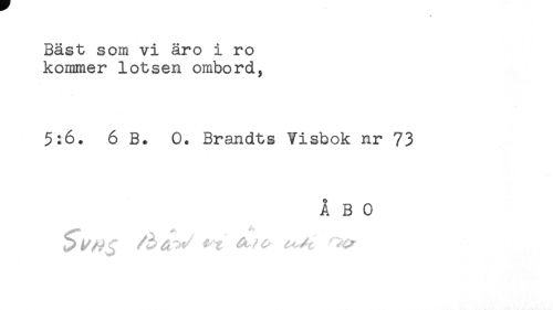 //// Bäst som vi äro i ro //// kommer lotsen ombord, //// 5:6. 6 B. 0. Brandts Visbok nr 73 //// ÅBO //// ^ ^^ ^ ////