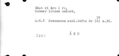 //// Bäst vi äro i ro, //// kommer lotsen ombord, //// 7? //// 4:6.? Svenssons saml.häfte Nr (6) s.36. //// E - " //// * //// * B 0 ////