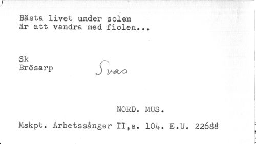 //// Bästa livet under solen //// är att vandra med fiolen... //// i //// ! //// Sk ^ //// BrSsarp ) ^ //// NORD. MUS. //// V s //// ) //// t //// Mskpt. Arbetssånger II,s. 104. E.U. 22688 ! //// H //// - //// } ////