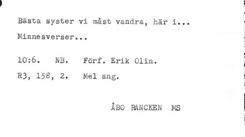 //// Bästa syster vi måst vandra, här i... //// Minne sverser... L //// i //// 10:6. NB. Förf. Erik Olin. //// i //// R3, 158, 2. Mel ang. //// c //// H //// ) //// i //// ÅBO RANCKEN MS //// F //// 6 //// h ////