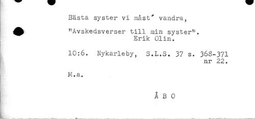 //// Bästa syster vi måst* vandra, //// ^ "Avskedsverser till min syster". //// Erik Olin. //// 10:6. Nykarleby, S.L.S. 37 s. 368-371 //// nr 22. //// M.a. //// ^ * ////