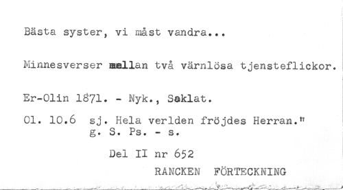 //// - //// )* //// Bästa syster, vi niåst vandra... //// Minnesverser mellan två värnlösa tjensteflickor. //// Er-01in 1671. - Nyk., Saklat. //// 01. 10.6 sj. Hela verIden fröjdes Herran." //// g. S. Ps. - s. //// Del II nr 652 //// RANCKEN FÖRTECKNING ////