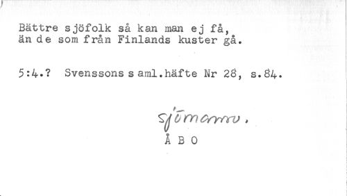 //// Båttre sjöfolk så kan man ej få, //// än de som från Finlands kuster gå. //// * //// i //// 5:4*? Svenssonssaml.häfte Nr 28, s.^4. //// ÅBO ////