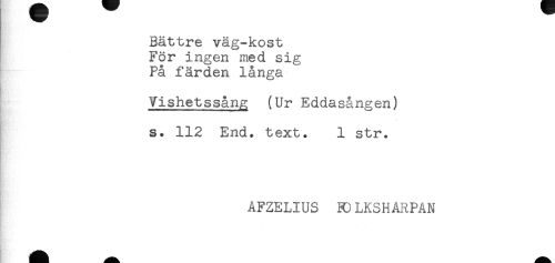 //// Bättre väg-kost //// För ingen med sig //// På färden långa //// Mj... //// I Vishetssång (Ur Eddasången) //// HB //// s. 112 End. text. 1 str. //// AFZELIUS K) LKSHARPAN //// - ////