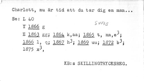 //// Charlott, nu är tid att du tar dig en man... //// Se: L 40 //// 11866 g ^ //// E 1863 gg; 1864 k,aa; 1865 t, nn,e^; //// 1866 1, q; 1867 h3; 1869 uu; 1872 b3; //// 1875 x^, //// ! //// i //// KB:s SKILLINGTRYCKSREG. ////