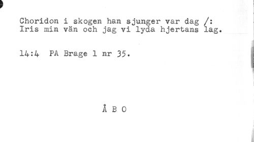 //// Choridon i skogen han sjunger var dag /: //// Iris min vän och jag vi lyda hjertans lag. //// i //// i //// 14:4 PA Brage 1 nr 35. //// ÅBO //// < ////