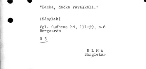 //// "DacKa, aacKa ravasKaii." //// ^ (Sånglek) //// Vgl. Gudhems hd, 111:59, s.6 //// Bergström //// t' //// D 3 //// t //// U L M Å //// Sånglekar ////