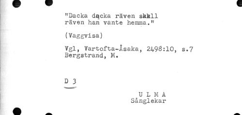 //// "Dacka dqcka räven skäll //// räven han vante hemma." //// (Vaggvisa) //// Vgl, Vartofta-Åsaka, 2493:10, s.7 //// Bergstrand, M. //// D 3 //// U L M A //// Sånglekar ////