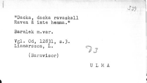 //// "Dacka, dacka ravaskall //// Räven ä inte hemma." //// Barnlek m.var. //// Vgl. Od, 12831, s.3. //// Linnarsson, L. //// (Barnvisor) //// U L M A //// < ////