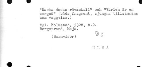 //// "Dacka dacka rävaskall" och "Värlen är en //// sorgeö" (båda fragment, sjungna tillsammans //// som vaggvisa.) //// Vgl. Holmstad, 5326, s.2. //// Bergstrand, Maja. //// 3 ? //// (Barnvisor) //// . //// U L M A ////