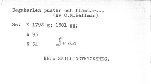 //// Dagakarlen pustar och flämtar... //// (Av C.M.Bellman) i //// ! //// Se: E 1798 g; 1801 gg; //// t //// A 95 //// N 54 ^ c //// KB:s SKILLIMGTRYCKSREG. //// f //// i //// * //// i //// < ////