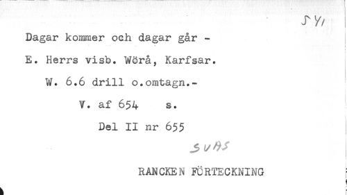 //// J //// //Dagar kommer och dagar går - //// - ^ ... . i //// < //// E. Herrs visb. Wörå, Karfsar. //// W. 6.6 drill o.omtagn.- //// V. af 654 S. //// Del II nr 655 //// i //// RANCKEN FÖRTECKNING i //// i ////
