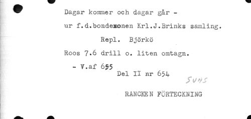 //// ^ uagar Kommer ocn aagar gar - //// * //// ur f.d.bondesonen Krl.J.Brinks samling. //// Repl. Björkö //// Roos 7*6 drill o. liten omtagn. //// - V.af 6^5 //// Del II nr 654 //// . //// RÅNCKEN FÖRTECKNING ////