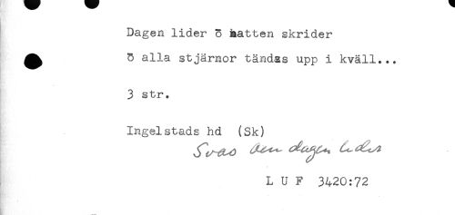 //// Dagen lider o hatten skrider //// ^ 5 alla stjärnor tändas upp i kväll... //// . //// 3 str. //// - //// Ingel stads hd (Sk) //// L U F 3420:72 ////