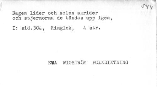 //// ' //// /Dagen lider och solen skrider //// och stjernorna de tändas upp igen, //// - //// 1: sid.304, Ringlek, 4 str. //// ] //// v //// ! //// ( //// ' //// { //// t //// i //// < //// * //// f //// ! //// i //// EWA WIGSTRÖM FOLKDIKTNING //// : //// i //// f ////