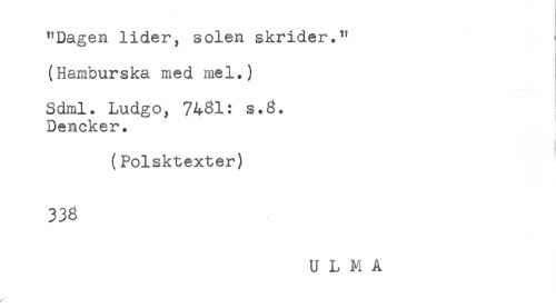 //// "Dagen lider, solen skrider." ^ //// r //// (Hamburska med mel.) //// Sdml. Ludgo, 7431: s.3. //// Dencker. //// (Polsktexter) //// 333 ////
