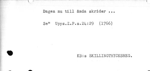 //// Dagen nu till ända skrider ... //// * //// Se" Upps.Z.P.s.24:29 (1766) //// * //// HR' //// ^ KB:s SKILLINGTRYCKSREG. ////