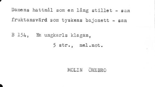 //// Damens hattnal som en lång stillet - san //// < //// i //// fruktansvärd som tyskens bajonett - san //// B 154, En. ungkarls klagan, //// 5 str., mel.not. //// * //// MOLIN ÖREBRO ////