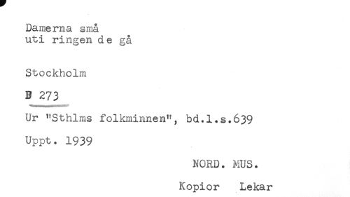 //// Damerna små //// uti ringen de gå //// Stockholm //// B 273 //// Ur "Sthlms folkminnen", hd.l.s.639 //// Uppt. 1939 //// * //// NORD. MUS. //// Kopior Lekar ////