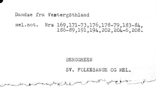 //// Dandse fra Veetergöthland //// mel.not. Nrs 169,171-73,176,178-79,183-84, //// 186-89,191,194,202,204-6,208. //// BERGGREEN //// SV. FOLKESANGE OG MEL. //// ...""T** ////