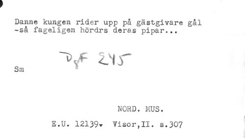 //// Danne kungen rider upp på gästgivare gål //// -så fageligen hördrs deras pipar... //// Sm //// NORD. HUS. //// E.U. 12139^ Visor,II. s.307 ////