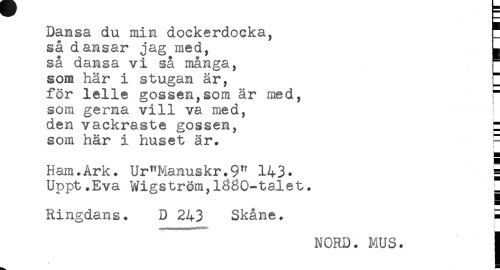 //// Dansa du min dockerdocka, //// så dansar jag med, ^ //// så dansa vi så många, //// som har i stugan är, 2 //// för lelle gossen,som är med, //// som gerna vill va med, //// den vackraste gossen, * //// som här i huset är. ^ //// a //// Ham.Ark. Ur"Manuskr.9" 143. = //// Uppt.Eva Wigström,1880-talet. ^ //// Ringdans. D 243 Skåne. S //// NORD. MUS. j ////