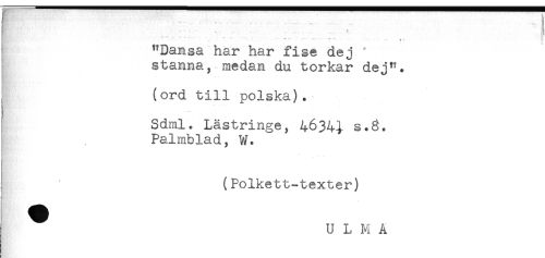 //// HH*'- tt . . . - —. //// - ' - - - - ....... .. .... ^ //// * -- r---. ^ - -- - . jt //// "Dansa har har fise dej //// stanna, medan du torkar dej". //// (ord till polska). //// Sdml. Lästringe, 4634;. s.8. //// Palmblad, W. //// (Polkett-texter) //// ; //// ^ U L M A ////