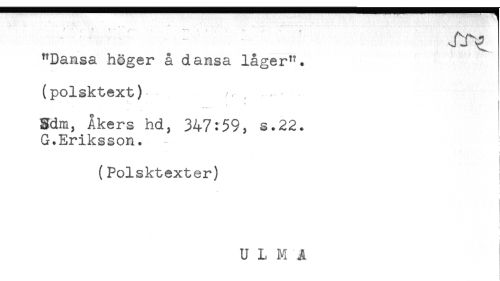 //// - - ' .- ' . ' ..... //// + ^ //// ^Dansa höger å dansa låger". //// (polsktext)- , ^ //// *... - . //// . //// Sdm, Åkers hd, 347:59, s.22. //// G.Eriksson. //// (Polsktexter) //// i //// U L M A ////