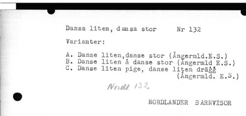 //// Dansa liten, dansa stor Nr 132 //// Varianter: //// A. Danse liten,danse stor (Ångermld.E.S.) //// B. Danse liten å danse stor (Angermld E.S.) //// C. Danse liten pige, danse liten drägg //// (Ångermld. E.S.) //// ^ NORDLANDER B ARNVISOR ////