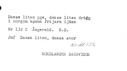 //// Danse liten pge, dan se liten drägg //// i morgom kpmma frijarn ijänn //// * //// Nr 132 C Ångermld. E.S. //// Jmf Dansa liten, dansa stor //// /J % //// NORDLANDER BARNVISCR ////