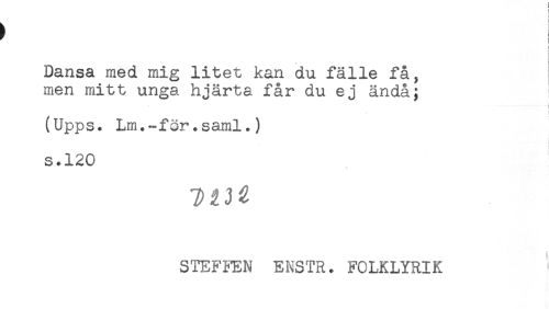 //// ] //// i //// i //// Dansa med mig litet kan du fälle få, //// men mitt unga hjärta får du ej ändå; ; //// * //// < //// (Upps. Lm.-för.saml.) //// s.120 //// STEFFEN ENSTR. FCLKLYRIK ////