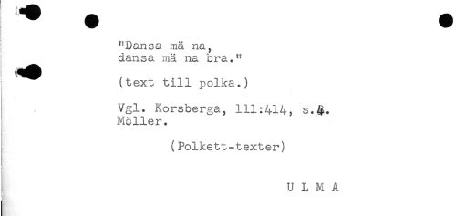 //// < //// < //// "Dansa mä na, //// dansa mä na bra." //// (text till polka.) //// Vgl. Korsberga, 111:414, s.$. //// ! Möller. //// - //// (Polkett-texter) //// U L M A ////