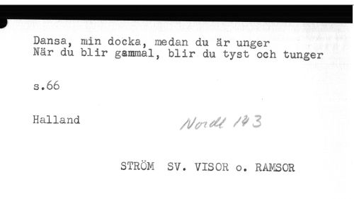 //// Dansa, min docka, medan du är unger //// När du blir gammal, blir du tyst och tunger //// s.66 //// Halland //// STRÖM SV. VISOR o. RAMSOR ////