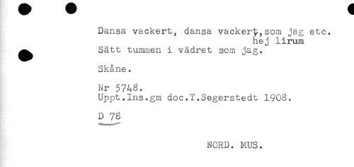 //// Dansa vackert, dansa vacker^,som jag etc. //// hej lirum //// ^^ Satt tummen i vädret som jag. //// Skåne * //// Nr 5746. //// Uppt.Ins.gm doc.T.Segerstedt 1908. //// D 78 //// NORD. MUS. ////