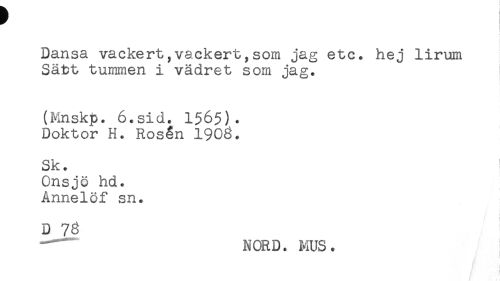 //// Dansa vackert,vackert,som jag etc. hej lirum //// Satt tummen i vädret som jag. //// (Mnskp. 6.sid. 156$). //// Doktor H. Rosén 1908. //// Sk. //// Onsjö hd. //// Annelöf sn. //// D 78 //// ----NORD. MUS. //// 1 //// ) ////
