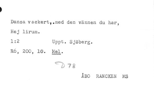//// Dansa vackert,.med den vännen du har, //// Hej lirum. //// 1:2 Uppt. Sjöberg. //// R6, 200, 10. Mel. //// T) 7g //// ÅBO RANCKEN MS ////