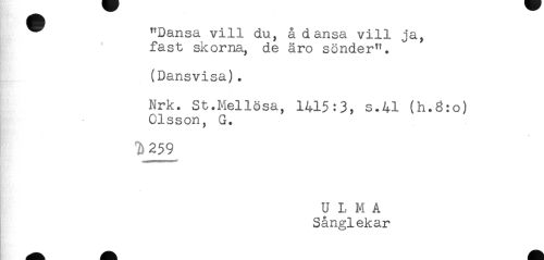 //// ^ "Dansa vill du, å dansa vill ja, //// fast skorna, de äro sönder". //// (Dansvisa). //// Nrk. St.Mellösa, 1415:3, s.41 (h.g:o) //// ! Olsson, G. //// T) 259 //// U L M A //// Sånglekar ////