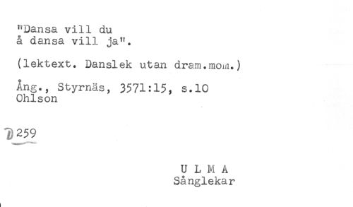 //// "Dansa vill du //// å dansa vill ja". //// (lektext. Danslek utan dram.mom.) //// Ang., Styrnäs, 3571:15, s.10 //// Ohlson //// 1)259 //// ULMA //// Sånglekar //// ! ////
