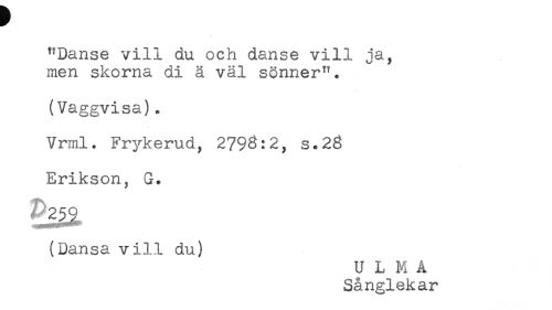 //// "Danse vill du och danse vill ja, //// men skorna di ä väl sönner". //// (Vaggvisa). //// Vrml. Frykerud, 279^:2, s.2g //// Erikson, G. //// 259 //// (Dansa vill du) //// U L M A //// Sånglekar ////
