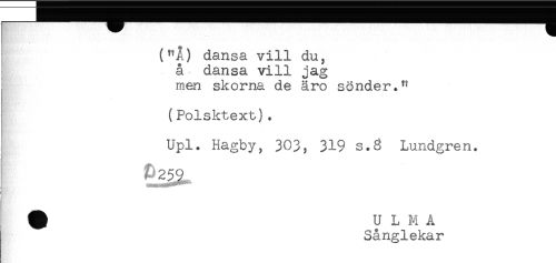 //// j ("Å) dansa vill du, //// ! å dansa vill jag //// men skorna de äro sönder." //// (Polsktext). //// Upl. Hagby, 303, 319 s.8 Lundgren. //// &259 //// s. ... //// # ULMA //// Sånglekar ////